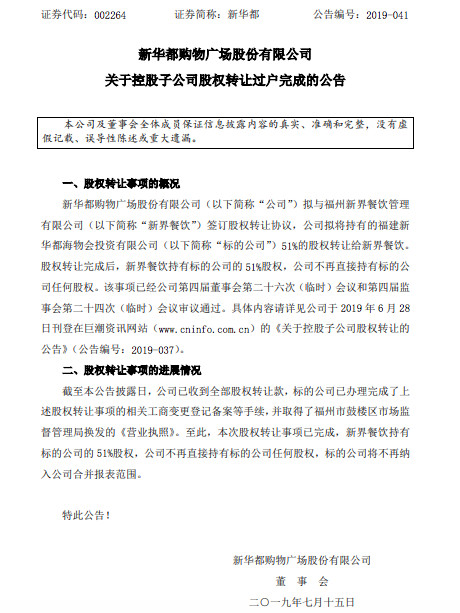 7月16日,新華都購物廣場股份有限公司發(fā)布“關(guān)于控股子公司股權(quán)轉(zhuǎn)讓過戶完成“的公告:與福州新界餐飲管理有限公司簽訂股權(quán)轉(zhuǎn)讓協(xié)議,新華都將持有的福建新華都海物會投資有限公司51%的股權(quán)轉(zhuǎn)讓給新界餐飲,新華都不再直接持有標(biāo)的公司(即海物會)任何股權(quán),標(biāo)的公司將不再納入新華都合并報(bào)表范圍。