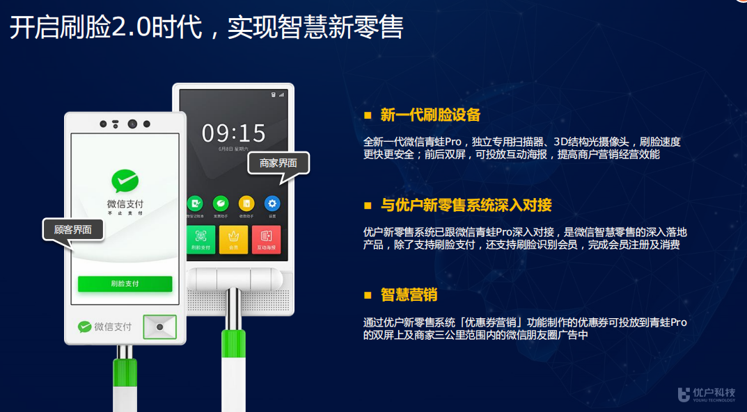 優(yōu)戶新零售系統(tǒng)已跟微信青蛙Pro深入對接,是微信智慧零售的深入落地產(chǎn)品,除了支持刷臉支付,還支持刷臉識別會員,完成會員注冊及消費