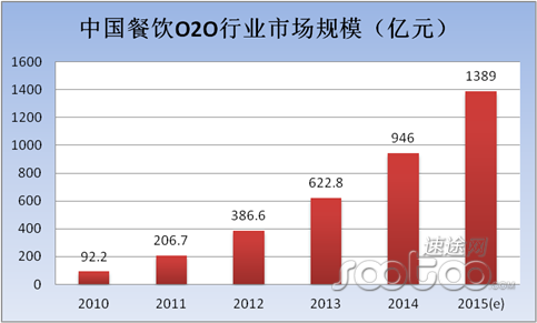 2015年,互聯(lián)網(wǎng)O2O模式在中國進(jìn)入高速發(fā)展階段,成為互聯(lián)網(wǎng)巨頭們的必爭潛力市場。在2010年只有92.2億元的市場規(guī)模,而在2015年這個(gè)數(shù)字預(yù)計(jì)將達(dá)到1389億元,預(yù)計(jì)相比2014年將增長46.8%,五年時(shí)間市場擴(kuò)大超過十倍。日益普及的移動(dòng)支付習(xí)慣、餐飲O2O的巨大市場,以及商家越來越完善的服務(wù)、價(jià)格補(bǔ)貼等,促進(jìn)了餐飲O2O這一行業(yè)的發(fā)展繁榮。