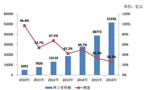 2010-2016 年中國(guó)網(wǎng)絡(luò)零售交易額增長(zhǎng)情況