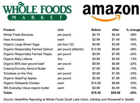 巨頭亞馬遜在完成對(duì)有機(jī)食品超市 Whole Foods 的收購(gòu)后,用一紙聲明氣炸了所有對(duì)手:亞馬遜宣布 Whole Foods 將立刻實(shí)施全面降價(jià),并將為亞馬遜的在線會(huì)員提供在這家“以貴出名”的超市的長(zhǎng)期優(yōu)惠。消息一經(jīng)發(fā)出,線下立刻被引爆:Whole Foods 最具特色的有機(jī)商品全部大甩賣(mài)——這家“高逼格”有機(jī)食品店的貨架被搶空了。
